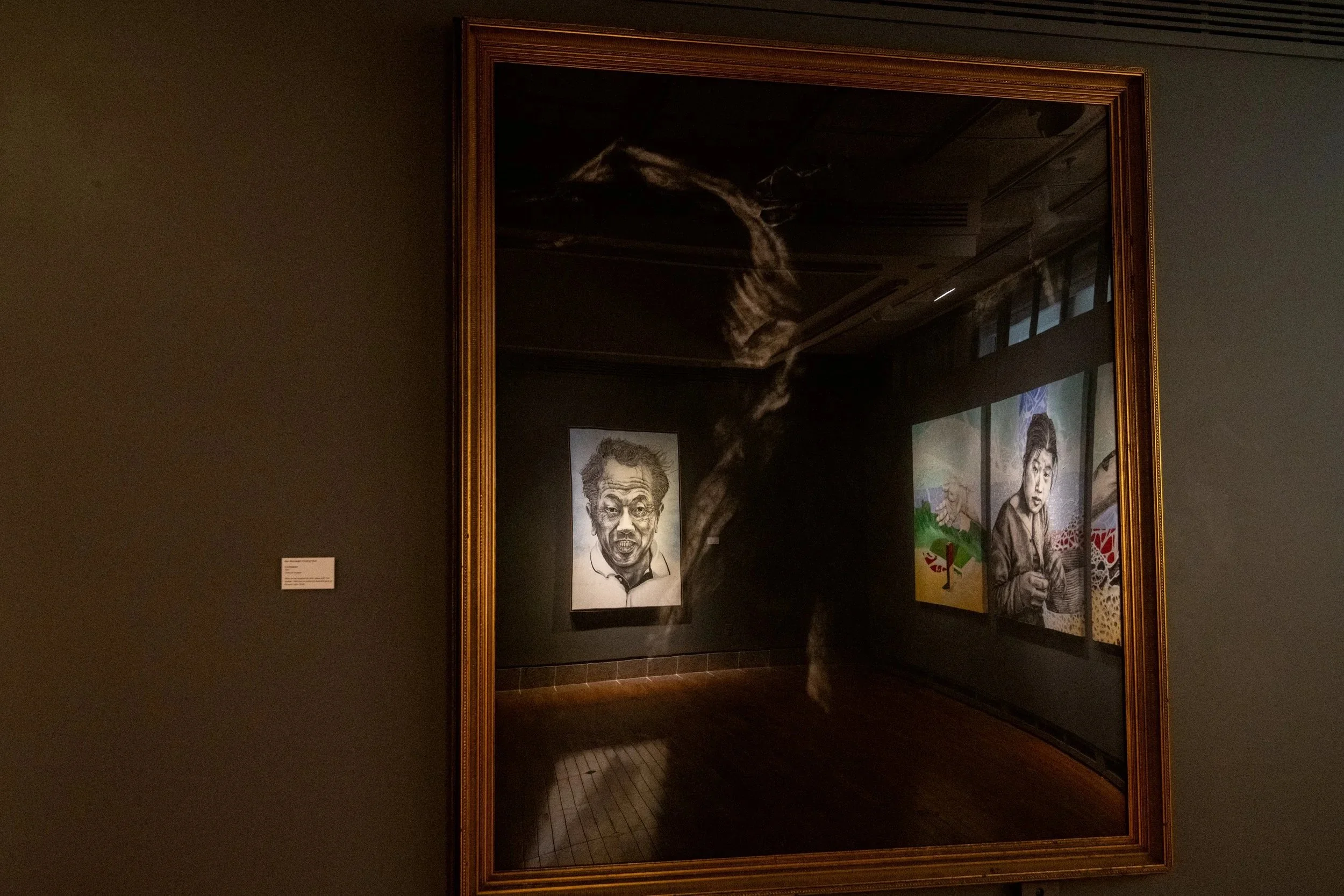 Each portrait in this exhibition incorporates charcoal, a medium uniquely suited to explore that tension. Charcoal is both dust and breath: friable, the residue of fire, yet capable of giving life to memory in strokes of shadow and light. More than other materials, charcoal is a medium that breathes and can animate. Treating charcoal as a sculptural medium, Rev. Chon models the movement of life through birth, death, resurrection, and to life beyond.